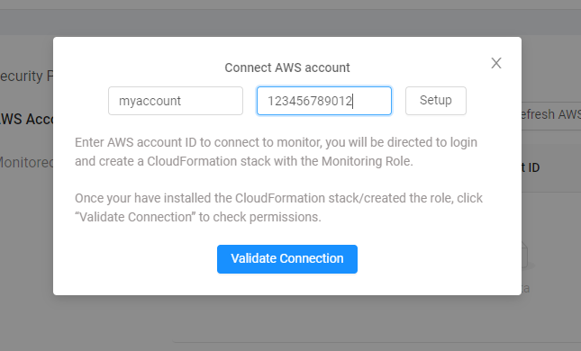 5. Once you have entered the AWS Account Name and AWS Account ID, click “Setup” button