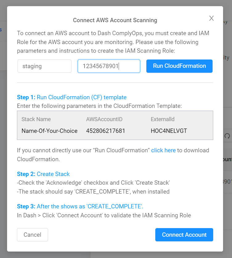 Once you have entered the AWS Account Name and AWS Account ID, click “Run CloudFormation”