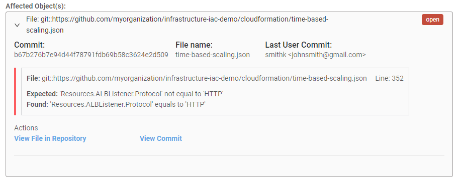 You can view ComplySource detected compliance issues related to a commit, by clicking on a specific “commit” row.