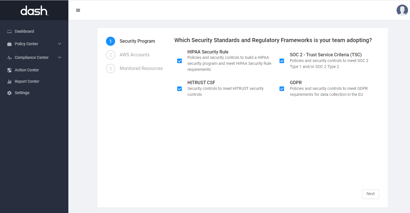 Select Your Applicable Regulatory Frameworks - Select the regulatory compliance standards applicable to your organization and then click “Next”. (This option can be changed later in the application settings)