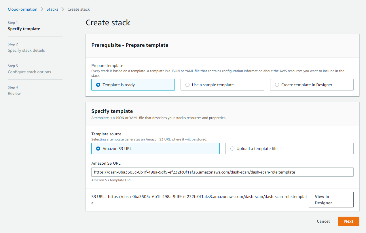 After logging it, you will be redirected to the CloudFormation setup page. It has already preloaded with the correct CloudFormation template, using an S3 URL