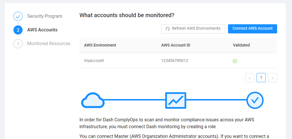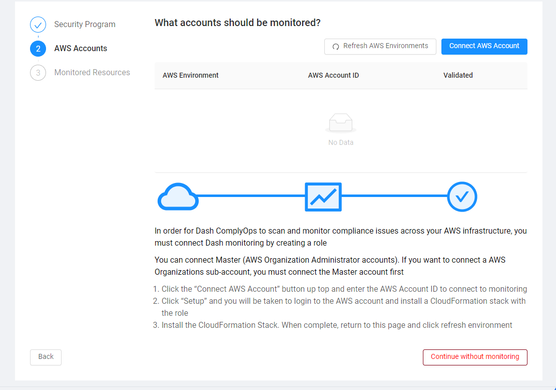 Connect AWS Accounts - You will be taken to the AWS account setup page. It is important to connect your AWS accounts otherwise Dash will not monitor your cloud accounts for security and compliance issues. You can connect accounts during the Setup Wizard or in the Settings > Monitoring Settings later.