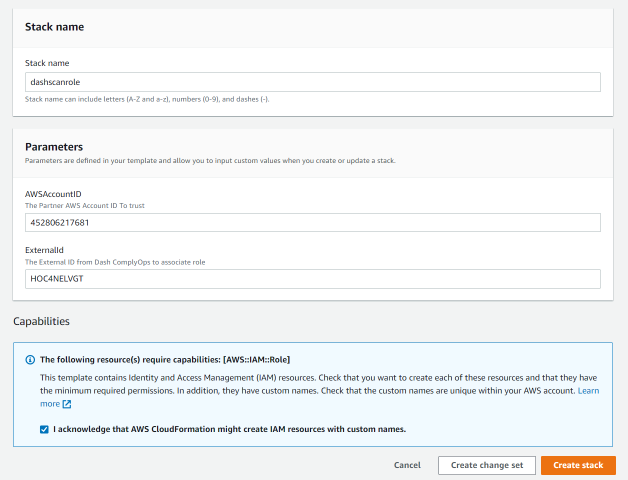 Stack Name = dashscanrole (or name selected by you)