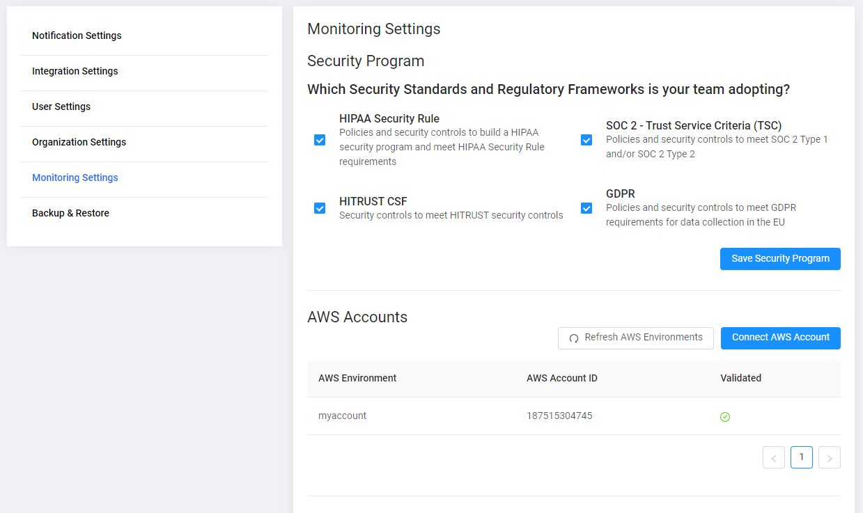 11. You can click the ‘Refresh AWS Environments’ to see updates to the connected accounts. After waiting a few seconds, you will now see that the environment if now validated. This means that scans are being ran on this environment.