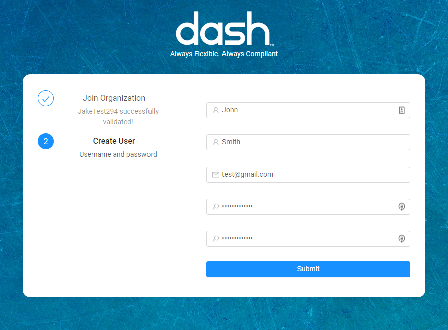 To get sign-up for a Dash ComplyOps account, please complete the following signup process. You will be provided with Dash application access after completing the signup process with the Dash team.