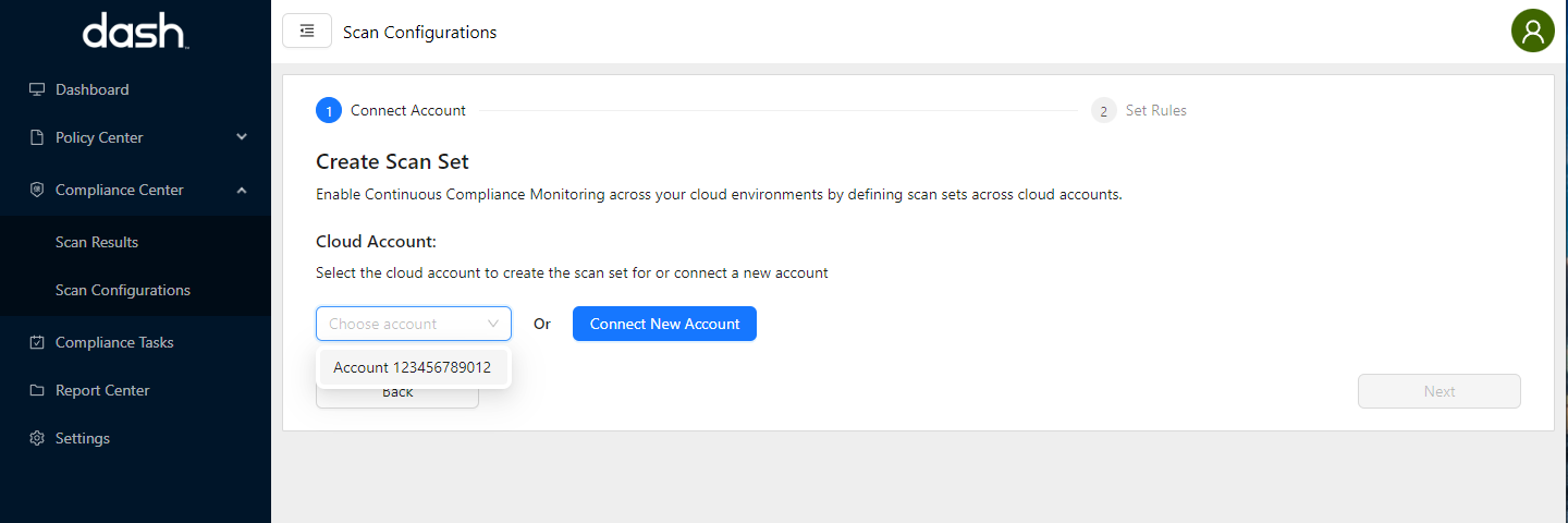 1. Choose an Existing Account - To create a new Scanset for different AWS regions/security frameworks