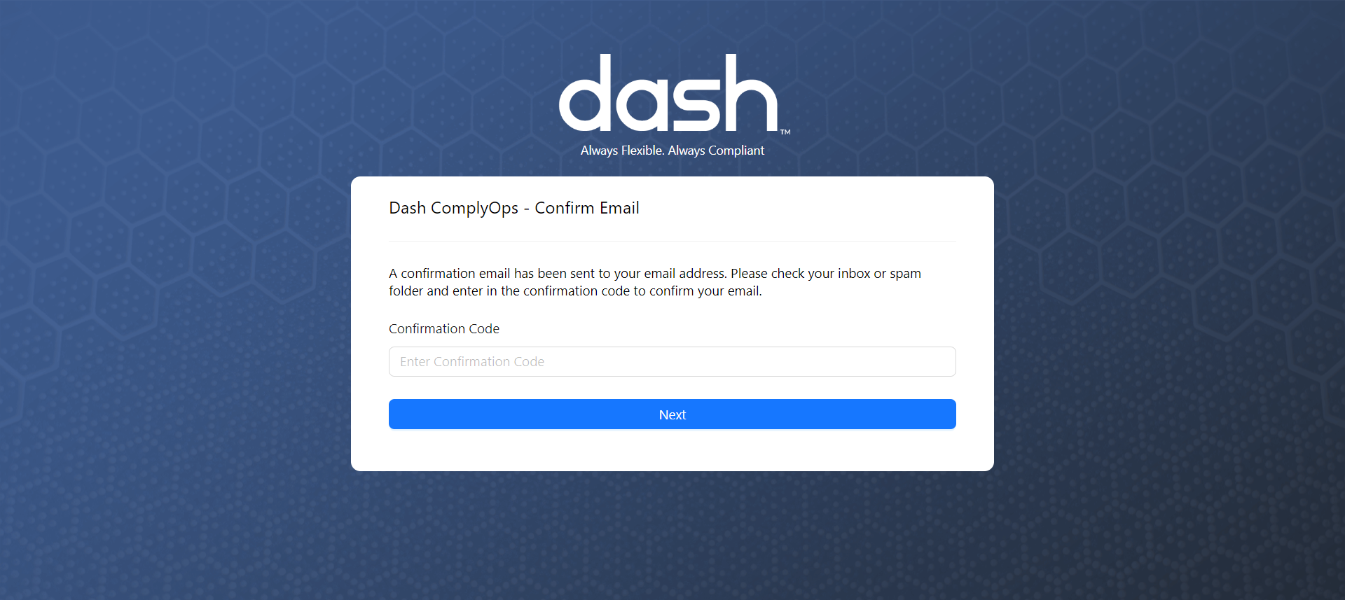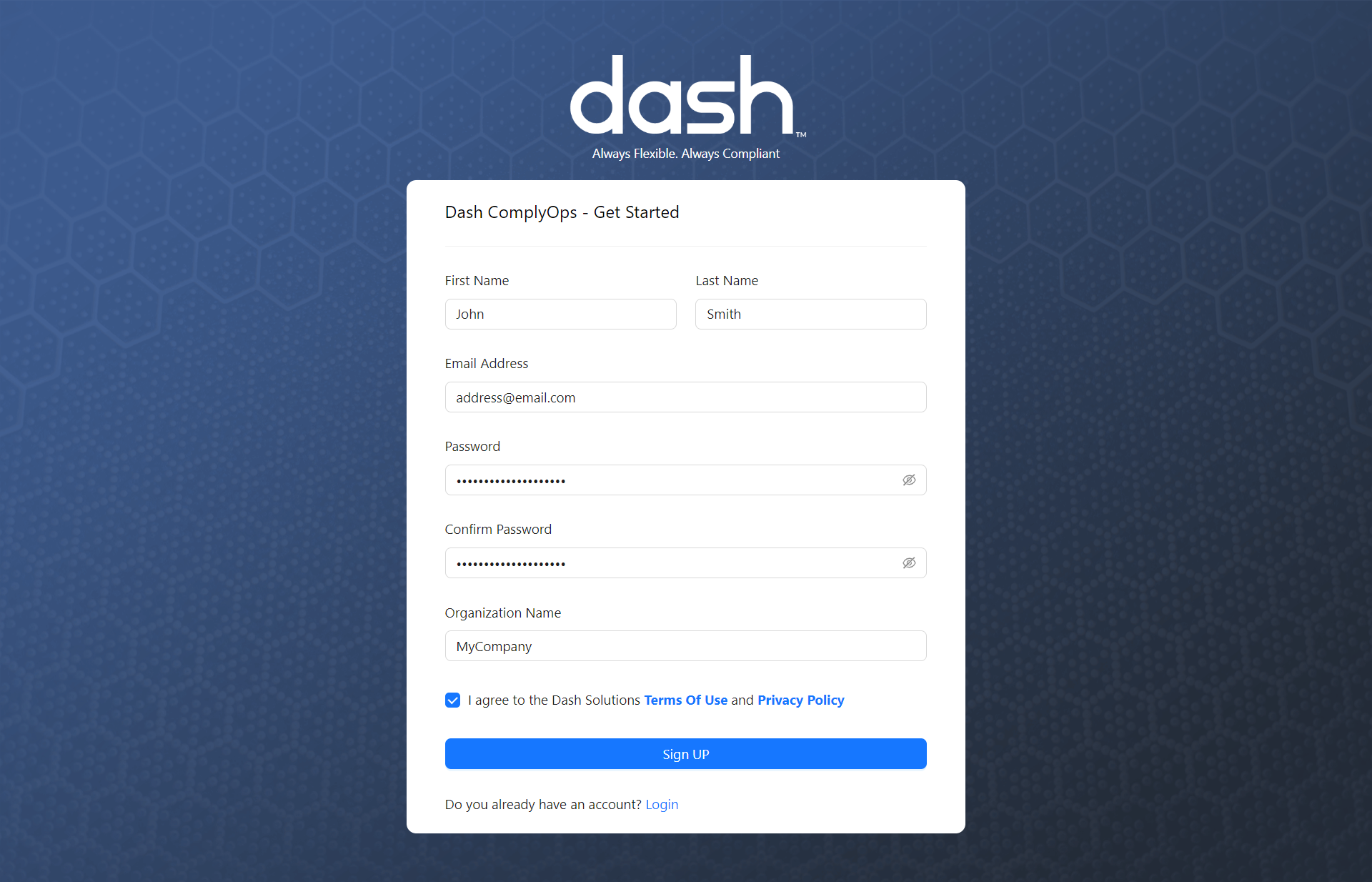 To get sign-up for a Dash ComplyOps account, navigate to the application signup page and complete the registration process and steps below. You will be provided with Dash application access and a 7-day trial of the Dash application.