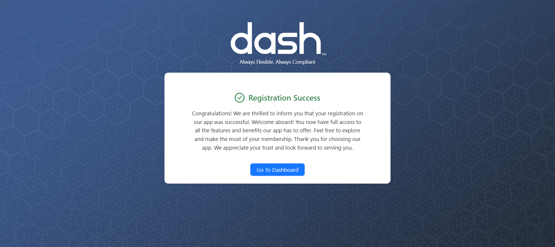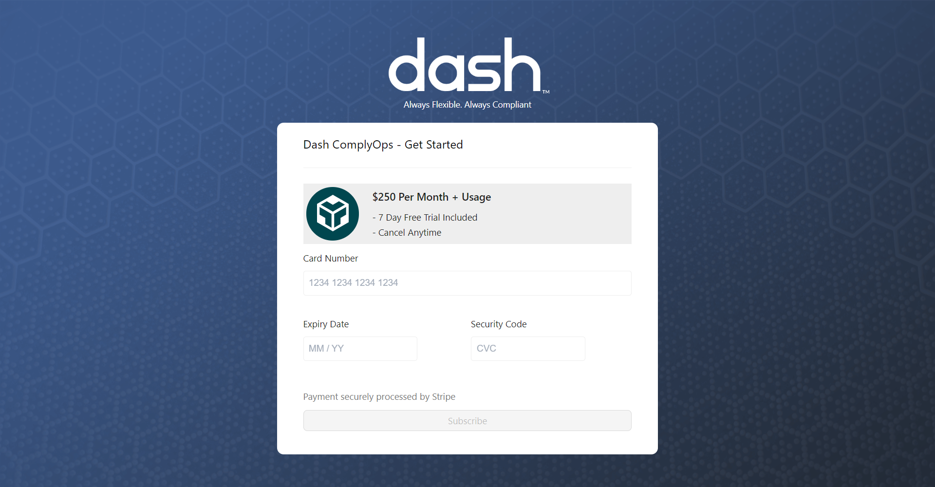 To get sign-up for a Dash ComplyOps account, navigate to the application signup page and complete the registration process and steps below. You will be provided with Dash application access and a 7-day trial of the Dash application.